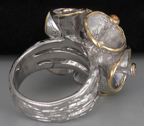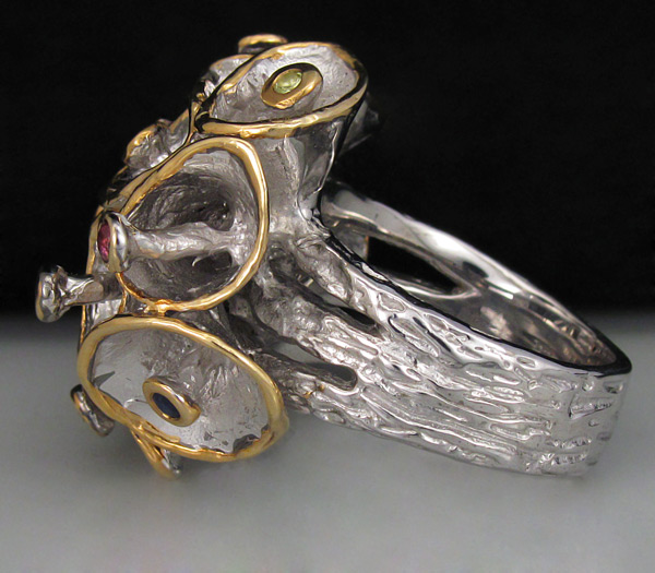 Кольцо из родированного матированного стерлингового серебра 925 пробы с сапфирами, перидотом, топазом, аметистом, цитрином, родолитом гранатом и цаворитом гранатом. Вес кольца — 24,9 гр. Площадка кольца — 29×27 мм. Выборочное золочение.