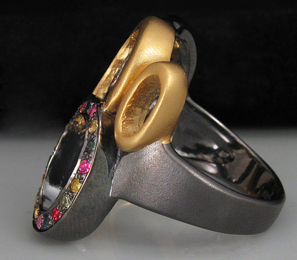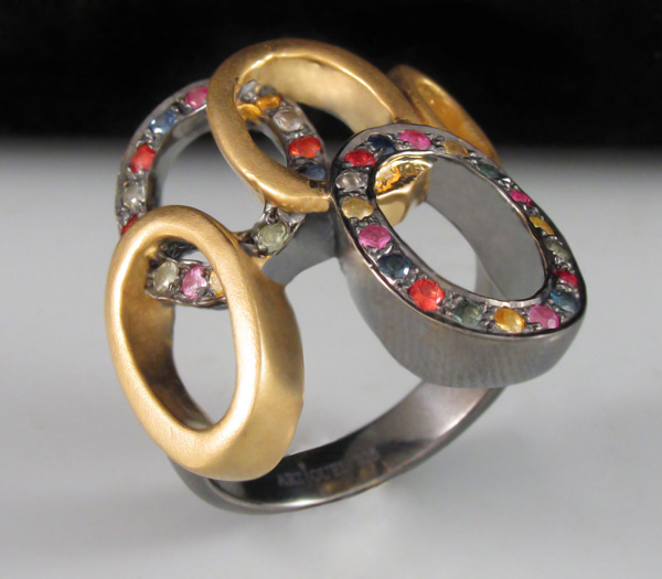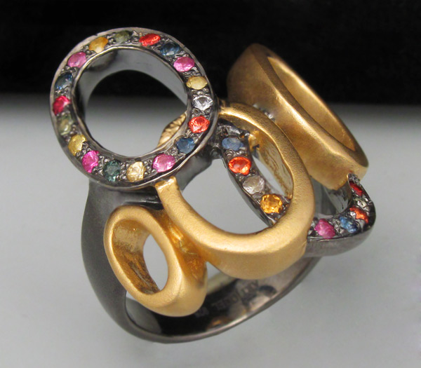 Кольцо из матированного черненого стерлингового серебра 925 пробы с разноцветными сапфирами. Вес кольца — 10,9 гр. Площадка кольца — 25×23 мм. Выборочное золочение.