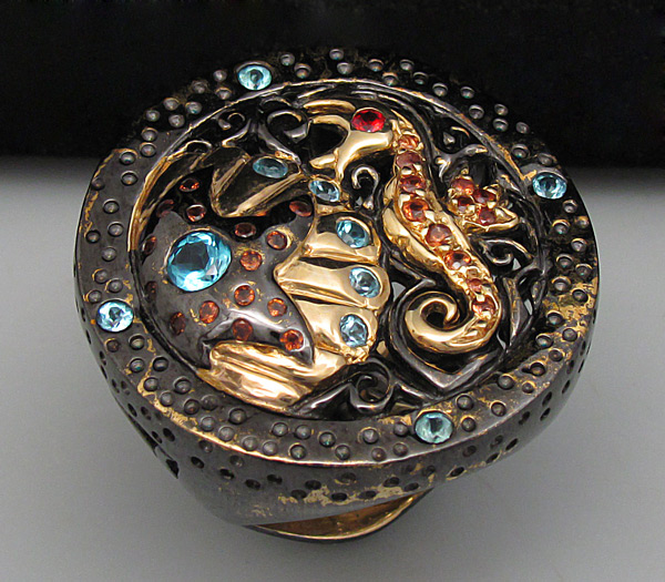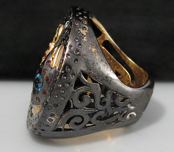 Кольцо из черненого стерлингового серебра 925 пробы с гранатом, топазами и сапфирами. Вес кольца — 21,9 гр. Площадка кольца — 30×29 мм. Выборочное золочение.