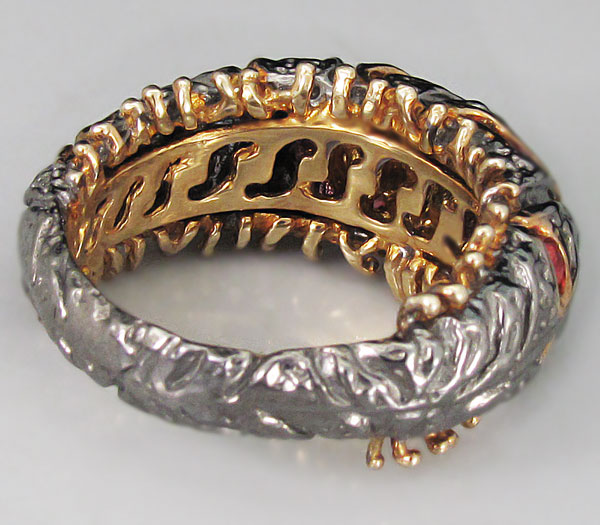 Кольцо из черненого текстурного стерлингового серебра 925 пробы с сапфирами. Вес кольца — 8,4 гр. Площадка кольца — 26×12 мм. Выборочное золочение.В наличии кольцо рахмером 17.75