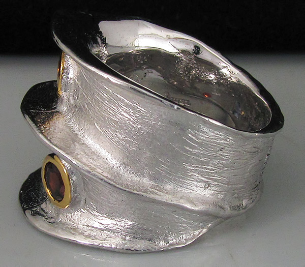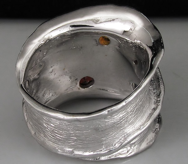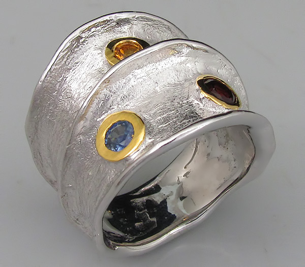 Кольцо из родированного стерлингового серебра 925 пробы с цитрином, гранатом и сапфиром. Вес кольца — 11,7 гр. Площадка кольца — 23×20 мм. Выборочное текстурирование и золочение.