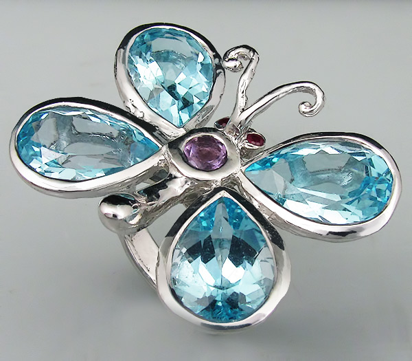 Кольцо из родированного стерлингового серебра 925 пробы с топазами (капля 14×9 мм), аметистом и сапфирами. Вес кольца — 15,6 гр. Площадка кольца — 34×25 мм.