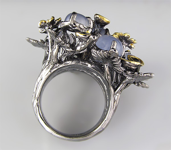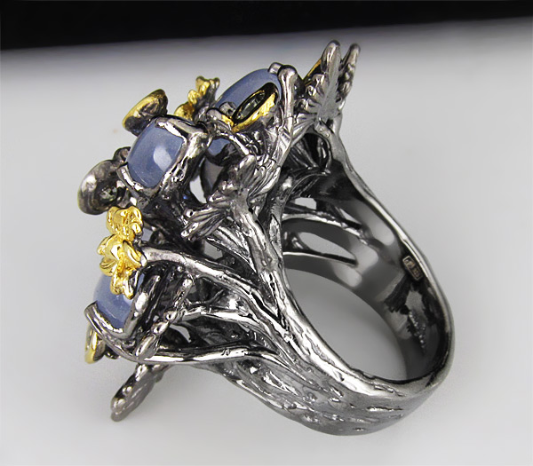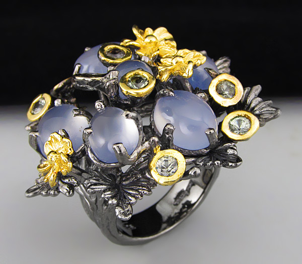 Кольцо из черненого стерлингового серебра 925 пробы с халцедоном и сапфирами. Вес кольца — 21,4 гр. Площадка кольца — 37×36 мм. Выборочное золочение.