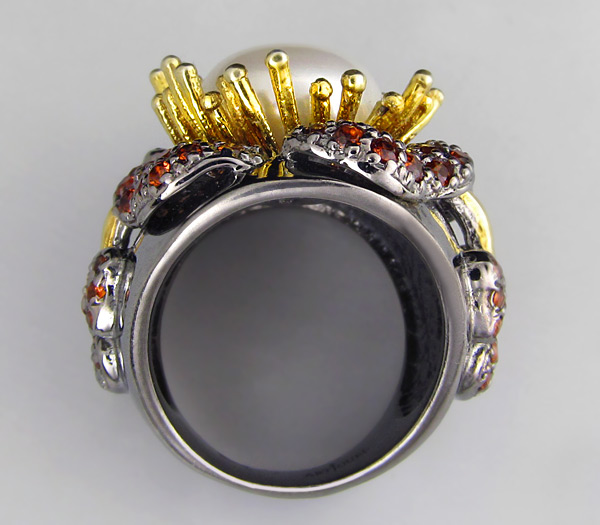 Кольцо из черненого стерлингового серебра 925 пробы с жемчугом и гранатами. Вес кольца — 17,4 гр. Площадка кольца — 27×25 мм. Выборочное золочение.