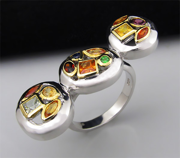Кольцо из стерлингового серебра 925 пробы с разноцветными сапфирами, цаворитами, родолитами и мозамбикскими гранатами. Вес кольца — 8,6 гр. Площадка кольца — 38×14 мм. Выборочное золочение.