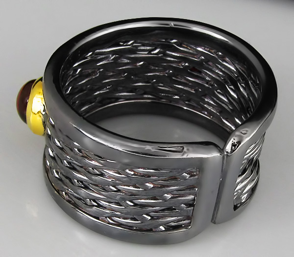 Кольцо из черненого стерлингового серебра 925 пробы с гранатами. Вес кольца — 8,7 гр. Площадка кольца — 22×12 мм. Выборочное золочение.
