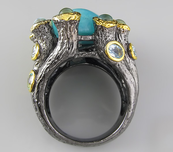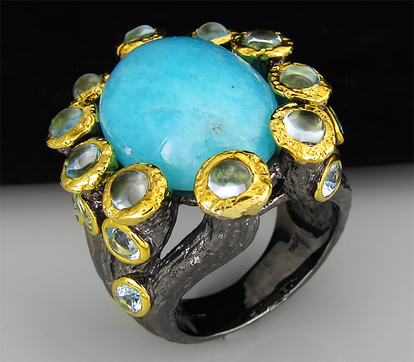 Кольцо из черненого стерлингового серебра 925 пробы с амазонитом и топазами. Вес кольца — 23,8 гр. Площадка кольца — 31×25 мм. Выборочное золочение.