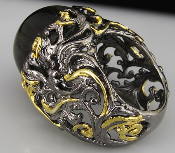 Кольцо из черненого стерлингового серебра 925 пробы с лабрадоритом. Вес кольца — 19,9 гр. Площадка кольца — 28×24 мм. Выборочное золочение.