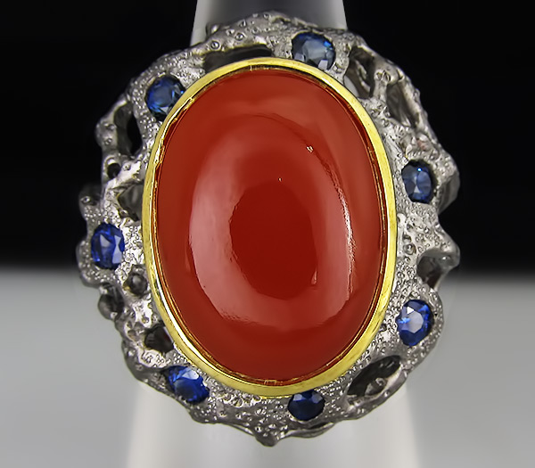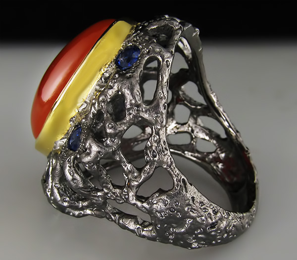 Кольцо из черненого стерлингового серебра 925 пробы с корнелианом и сапфирами. Вес кольца — 14,3 гр. Площадка кольца — 27×25 мм. Выборочное золочение.