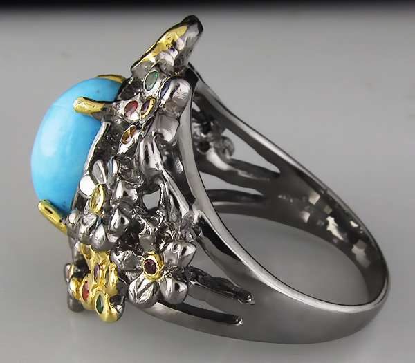 Кольцо из черненого стерлингового серебра 925 пробы с бирюзой, сапфирами, аметистами, цаворитами и родолитами гранатами. Вес кольца — 10,4 гр. Площадка кольца — 23×23 мм. Выборочное золочение.В наличии кольцо размером: 18.5