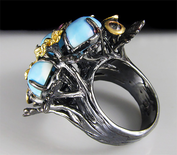 Кольцо из черненого стерлингового серебра 925 пробы с бирюзой, аметистами, сапфирами, цаворитами и мозамбикскими гранатами. Вес кольца — 22,4 гр. Площадка кольца — 36×36 мм. Выборочное золочение.
