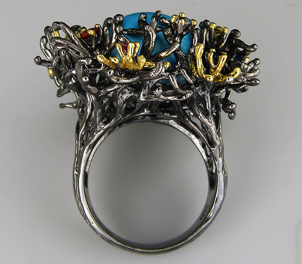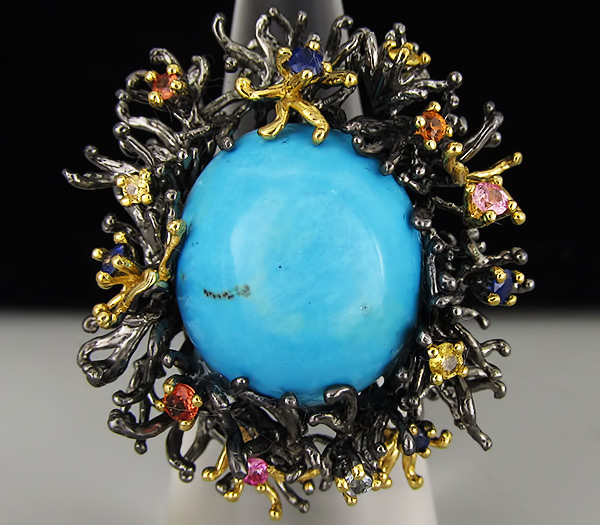 Кольцо из черненого стерлингового серебра 925 пробы с амазонитом, топазами и сапфирами. Вес кольца — 20,6 . Площадка кольца — 33×32 мм. Выборочное золочение.