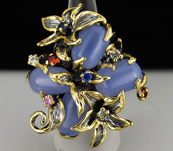 Кольцо из черненого стерлингового серебра 925 пробы с халцедоном и сапфирами. Вес кольца — 32,1 гр. Площадка кольца — 43×35 мм. Выборочное золочение.