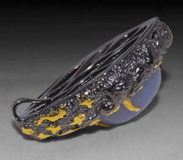 Кулон из черненого стерлингового серебра 925 пробы с халцедоном (кабошон 20×15 мм), гранатами, перидотами, аметистами и голубыми топазами. Общая масса вставок 24,05 карат. Выборочное золочение. Размер кулона — 42×26 мм. Вес — 19,1 гр.