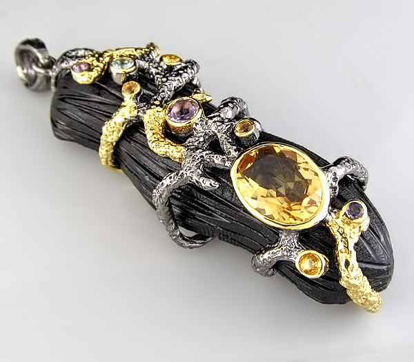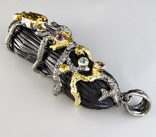 Кулон из дерева Sono и черненого стерлингового серебра 925 пробы с цитрином (10×7мм), аметистами, сапфирами и топазом. Вес — 12,56 гр. Размер кулона — 70×22 мм. Выборочное золочение.
