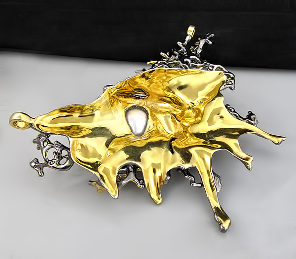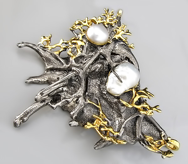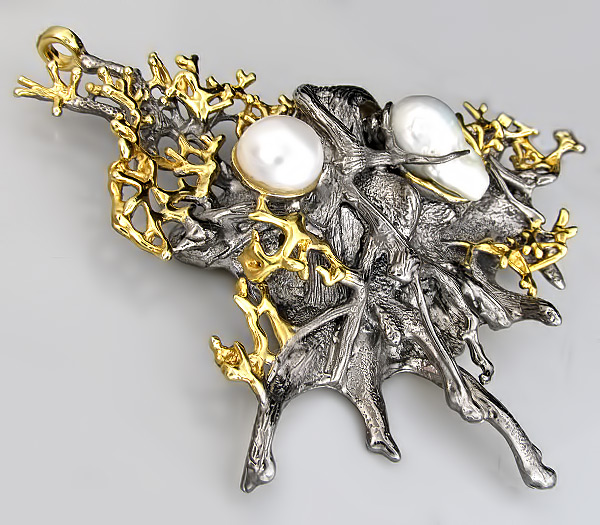 Кулон из черненого стерлингового серебра 925 пробы с круглым (13 мм) и фантазийным жемчугом (13×21 мм). Вес — 89,6 гр. Размер кулона — 104×82 мм. Выборочное золочение.