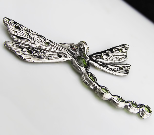 Кулон из серебра 925 пробы «Стрекоза» с перидотами и гранатами.Серебро 925, Золочение, Чернение Инкрустация: Гранат, Перидот Вес изделия: 13,7 грамм Размер: 66×42 мм