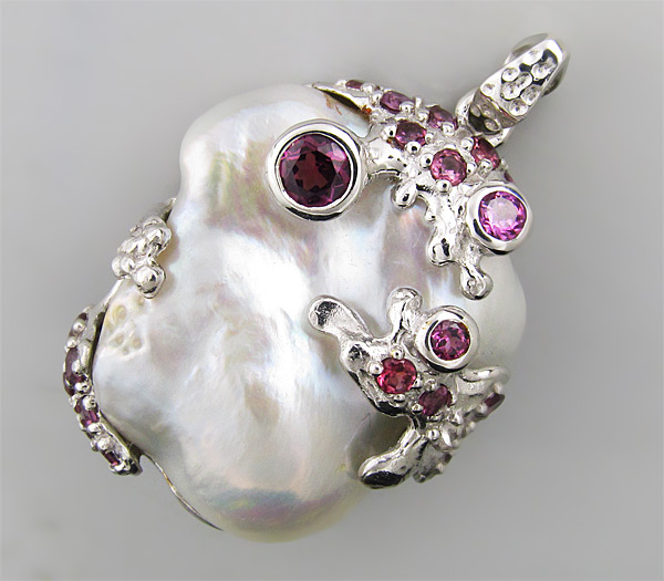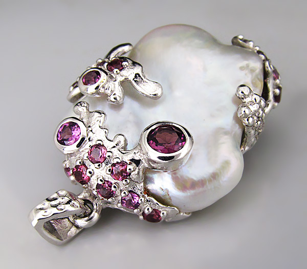 Кулон из стерлингового серебра 925 пробы с жемчугом и родолитами гранатами. Вес — 18,1 гр. Размер кулона — 42×27 мм.