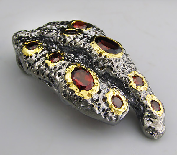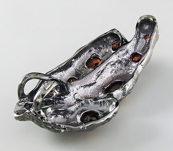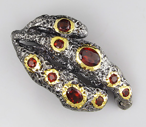 Кулон из черненого стерлингового серебра 925 пробы с гранатами. Вес — 13,5 гр. Размер кулона — 44×24 мм. Выборочное золочение.