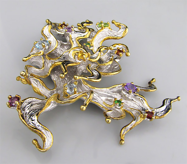 Кулон из стерлингового серебра 925 пробы с родолитом, цаворитами и мозамбикскими гранатами, аметистами, цитрином, топазами и перидотом. Вес — 23,6 гр. Размер кулона — 61×55 мм. Выборочное золочение.