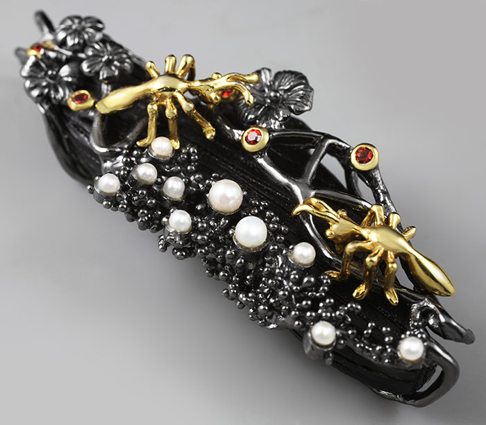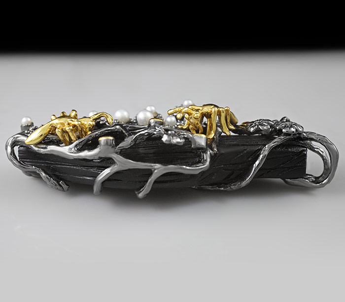 Серебро 925, Золочение, ЧернениеИнкрустация: Жемчуг, Сапфир, ДревесинаВес изделия: 18,6 граммРазмер: 67×27 мм