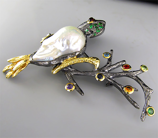 Брошь из черненого стерлингового серебра 925 пробы с жемчужиной, мозамбикским и цаворитами гранатами, аметистом, топазом, перидотом и сапфирами. Вес — 32,6 гр. Размер кулона — 71×63 мм. Выборочное золочение.