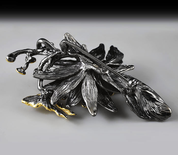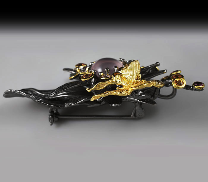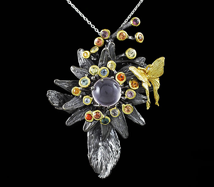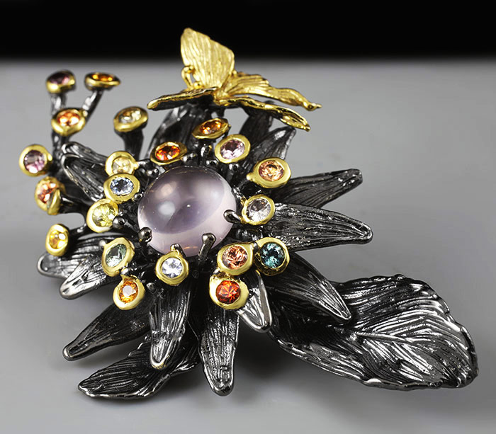Брошь/кулон из черненого стерлингового серебра 925 пробы с розовым кварцем и разноцветными сапфирами. Выборочное золочение.