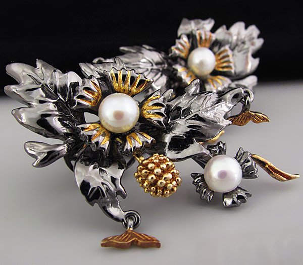 Серьги из черненого стерлингового серебра 925 пробы с жемчугом (6 мм). Вес — 23,0 гр. Размеры серег — 50×30 мм. Выборочное золочение.