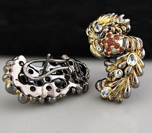 Серьги из черненого стерлингового серебра 925 пробы с топазами, гранатами и жемчугом. Вес — 29.6 гр. Размер серег — 37×20 мм. Выборочное золочение.