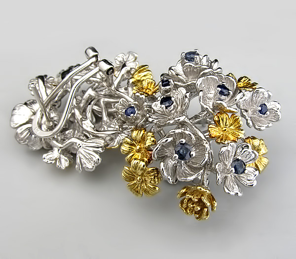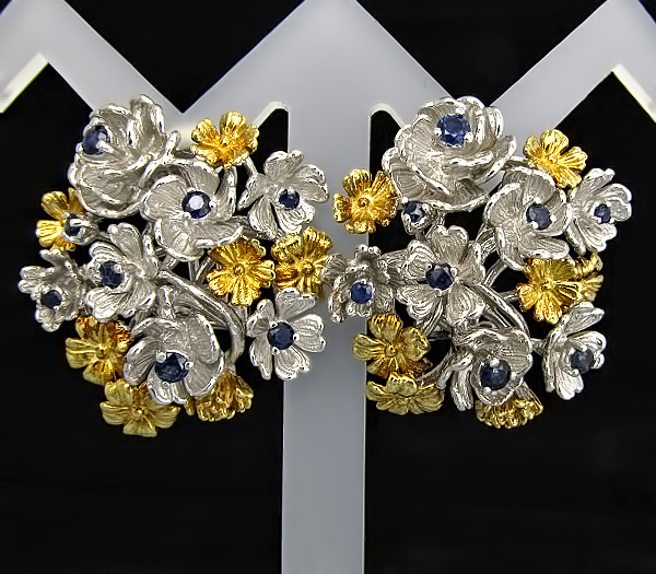 Серьги из родированного стерлингового серебра 925 пробы с синими сапфирами. Вес — 23,6 гр. Размер серег — 33×30 мм. Выборочное золочение.