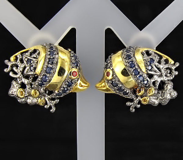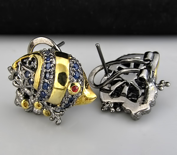 Серьги из черненного стерлингового серебра 925 пробы с сапфирами. Вес — 11,85 гр. Размер серег — 24×17 мм. Выборочное золочение.
