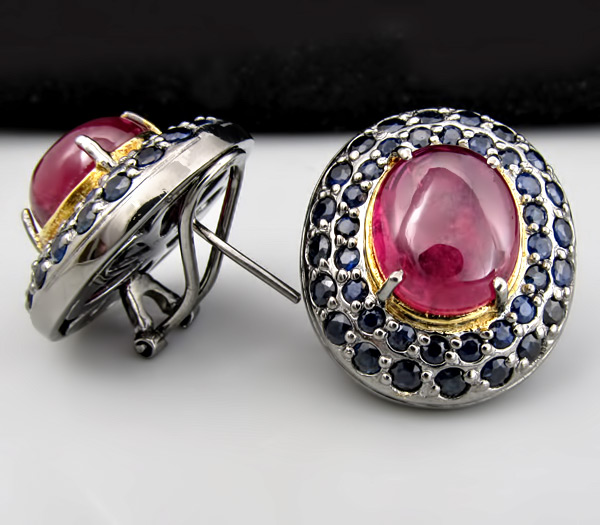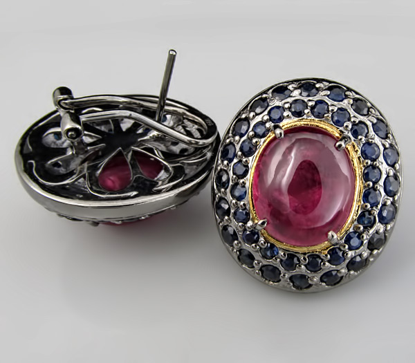 Серьги из черненного стерлингового серебра 925 пробы с  сапфирами. Размер центральных сапфиров кабошонов 13×11 мм. Вес — 25 гр. Размер серег — 26×23 мм. Выборочное золочение.