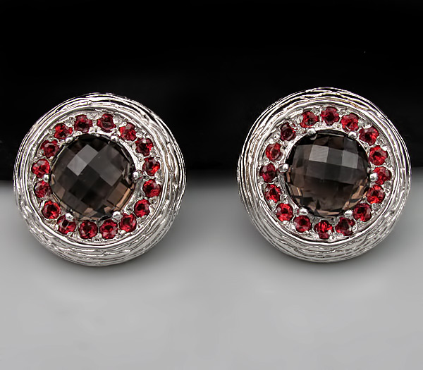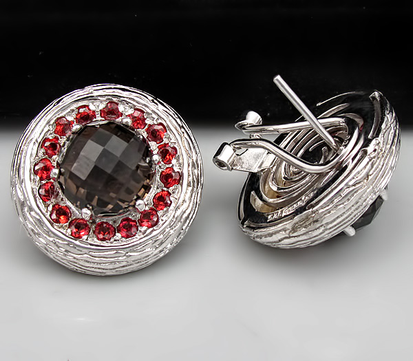 Серьги из текстурного родированного стерлингового серебра 925 пробы с дымчатыми топазами (11мм) и гранатами. Вес — 20,1 гр. Размер серег — 23×23 мм.