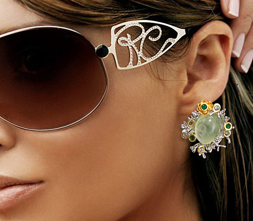Серьги из родированного стерлингового серебра 925 пробы с пренитами (кабошоны 18×13 мм), зелеными агатами и сапфирами. Вес — 24,4 гр. Размер серег — 33×29 мм. Выборочное золочение.