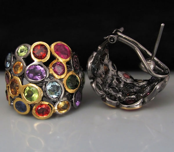 Серьги из черненого стерлингового серебра 925 пробы с турмалинами, мозамбикскими гранатами и родолитами гранатами, топазами, аметистами, перидотами и разноцветными сапфирами. Вес — 12,9 гр. Размер серег — 22×19 мм. Выборочное золочение.