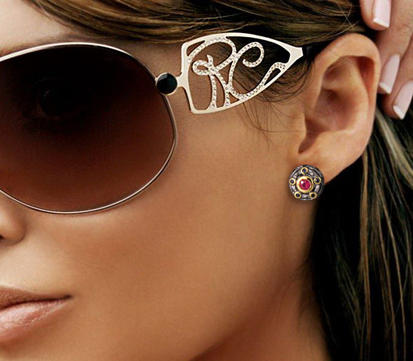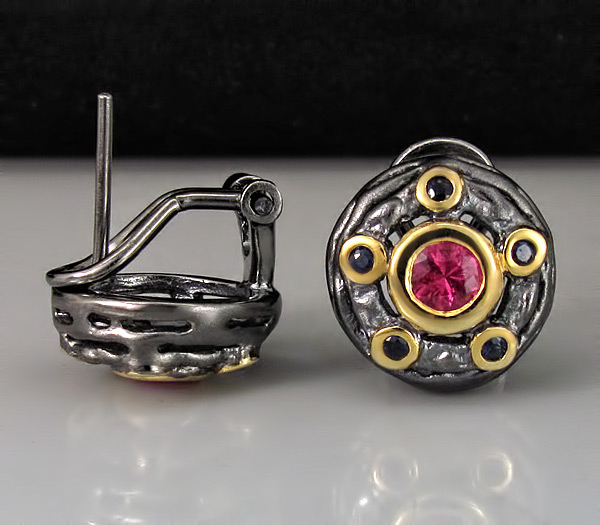 Серьги из черненого стерлингового серебра 925 пробы с сапфирами. Вес — 6,7 гр. Размер серег — 14×13 мм. Выборочное золочение.