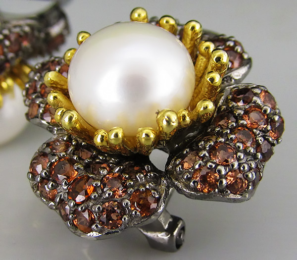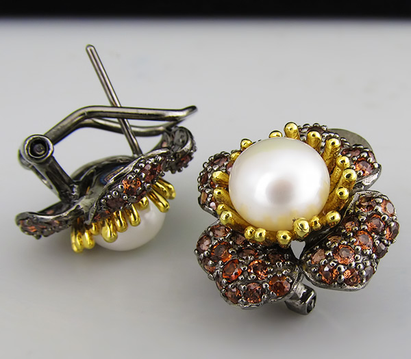 Серьги из черненого стерлингового серебра 925 пробы с жемчугом и гранатами. Вес — 9,5 гр. Размер серег — 19×19 мм. Выборочное золочение.