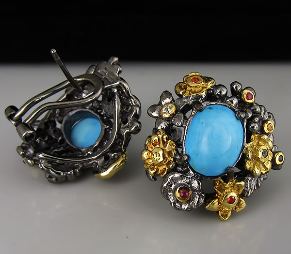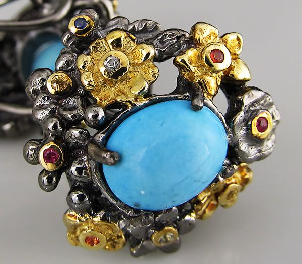 Серьги из черненого стерлингового серебра 925 пробы с бирюзой и разноцветными сапфирами. Вес — 16,4 гр. Размер серег — 23×21 мм. Выборочное золочение.