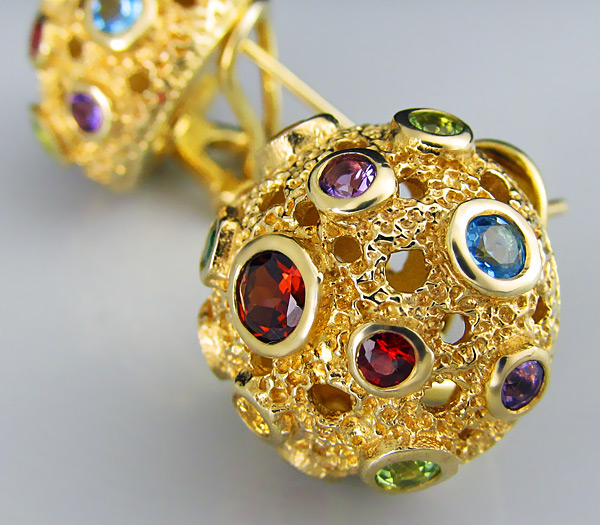 Серьги из позолоченного стерлингового серебра 925 пробы с мозамбикскими и цаворитами гранатами, аметистами, перидотами, топазами и сапфирами. Вес — 12,8 гр. Размер серег — 19×19 мм.