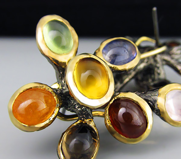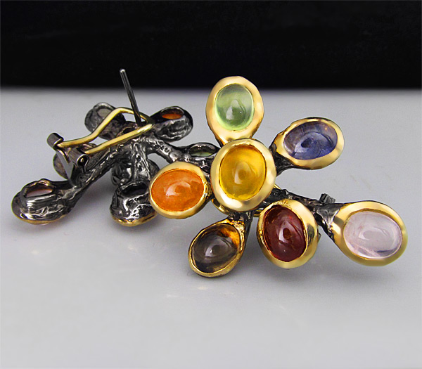 Серьги из черненого стерлингового серебра 925 пробы с розовым кварцем, мозамбикскими и малайа гранатами, иолитами, цитринами, дымчатыми топазами и перидотами. Вес — 25 гр. Размер серег — 35×29 мм. Выборочное золочение.