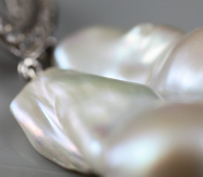 Серьги из стерлингового серебра 925 пробы с пузырчатым жемчугом и бесцветными топазами. Вес — 13,5 гр. Размер серег — 66×14 мм.