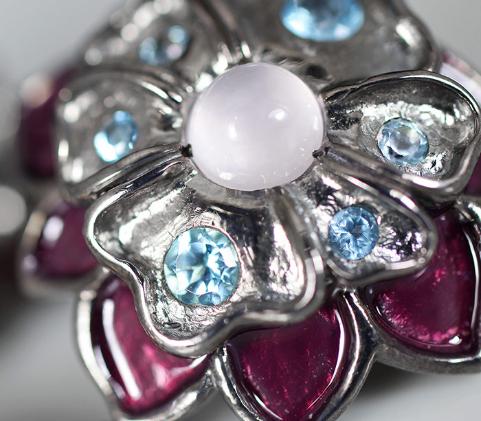 Серьги из черненого стерлингового серебра 925 пробы с розовым кварцем и топазами. Вес — 17,1 гр. Размер серег — 46×24 мм. Выборочное золочение и покрытие эмалью.