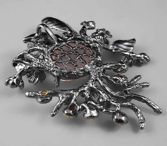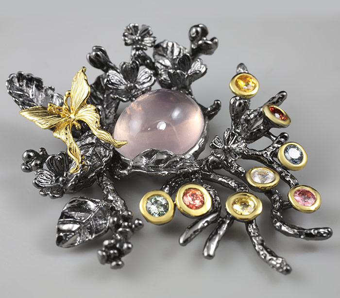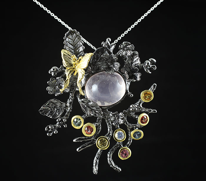 Кулон из черненого стерлингового серебра 925 пробы с розовым кварцем и разноцветными сапфирами. Вес — 25,7 гр. Размер кулона — 61×49 мм. Выборочное золочение.