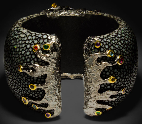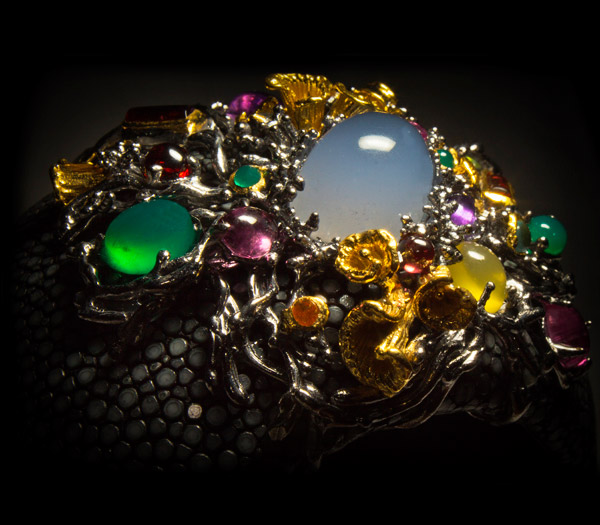Браслет из стерлингового серебра 925 пробы с кожей ската, аметистами, агатами, топазами, разноцветными турмалинами, цитринами, халцедоном кабошоном (19×13 мм), родолитами, спесартинами и родолитами гранатами. Площадка браслета 76 х 53 мм. Вес браслета — 114 гр. Выборочное золочение.