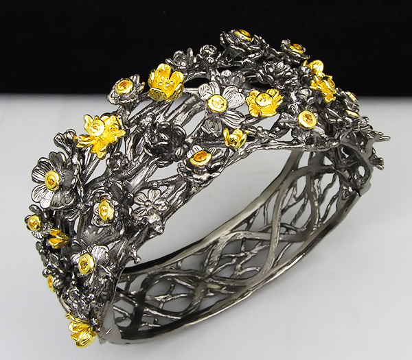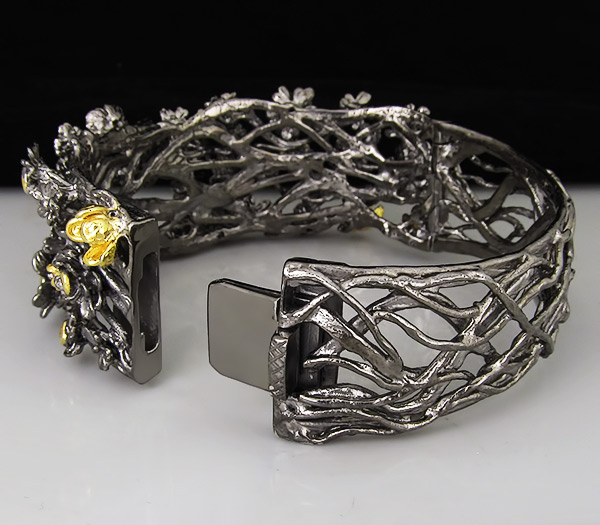 Браслет из черненого стерлингового серебра 925 пробы с разноцветными сапфирами. Выборочное золочение. Вес — 72.6 гр. Размер браслета — 73×29 мм.