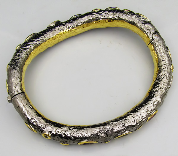 Браслет из черненого стерлингового серебра 925 пробы с разноцветными турмалинами (6×4 мм) и зелеными сапфирами. Вес — 44,3 гр. Размер площадки — 80×10 мм. Выборочное золочение.