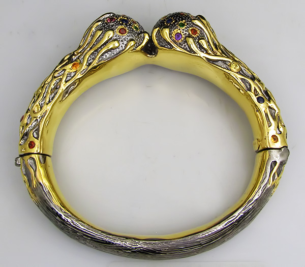 Браслет из черненого стерлингового серебра 925 пробы с самоцветами. Выборочное золочение. Вес — 65,5 гр. Размер площадки — 77×20 мм.