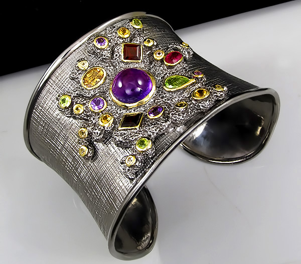 Браслет из серебра 925 пробы с самоцветами.Серебро 925, Золочение, Чернение Инкрустация: Аметист, Гранат, Перидот, Сапфир, Цитрин Вес изделия: 68,8 грамм Размер: 50×48 мм