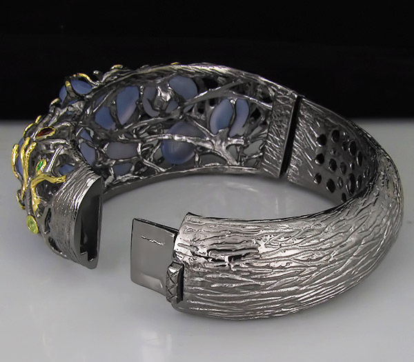 Браслет из черненого стерлингового серебра 925 пробы с халцедоном, аметистами, гранатами, перидотами, топазами, цаворит гранатами и цитринами. Вес — 86,9 гр. Площадка браслета — 74×31 мм. Выборочное золочение.