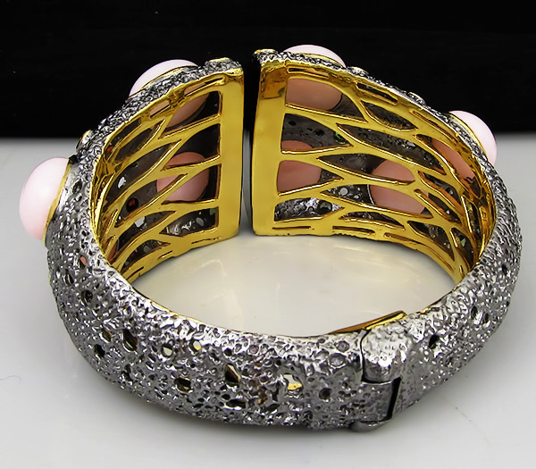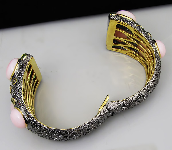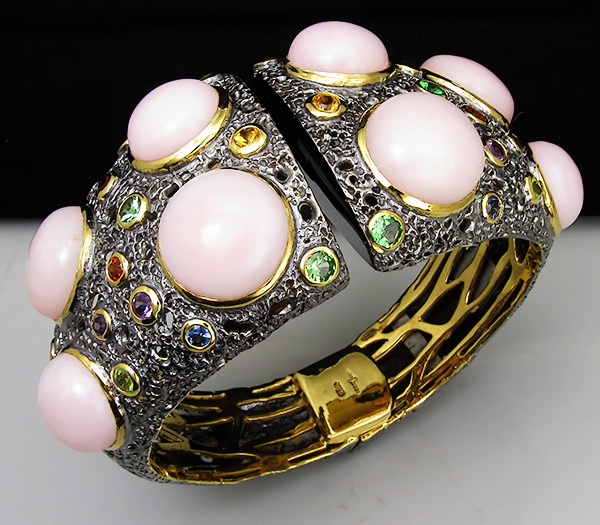 Браслет из черненого стерлингового серебра 925 пробы с крупными розовыми опалами кабошонами, аметистами, гранатами, перидотами, сапфирами, цаворит гранатами. Вес — 92,5 гр. Площадка браслета — 77×39 мм. Выборочное золочение.